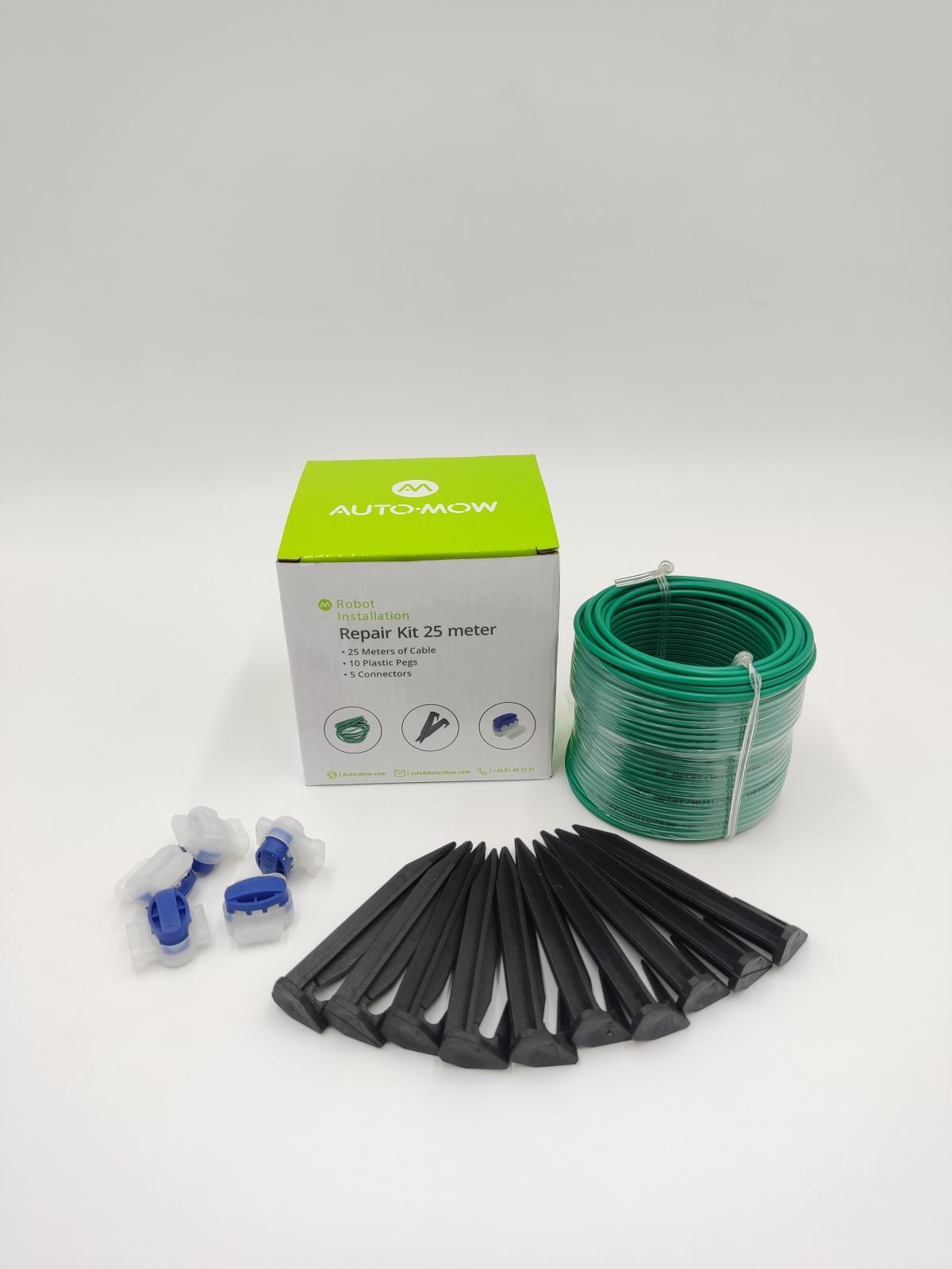 Az AM Robots javítókészlet tökéletes választás a sérült határoló vezeték javításához és a munkaterületen végzett kisebb igazításokhoz. Tartalmaz 25 méter 2,7 mm vastag határoló vezetéket, 10 rögzítő tüskét és 5 csatlakozót, amellyel a meglévő vezetékhez könnyedén új vezetékszakasz csatlakoztatható. A 25 méter vezeték akár kisebb plusz területek bekapcsolásához, vagy egy új tereptárgy (pl. valamilyen növény, trambulin, kerti sütögető, medence) is optimális lehet.