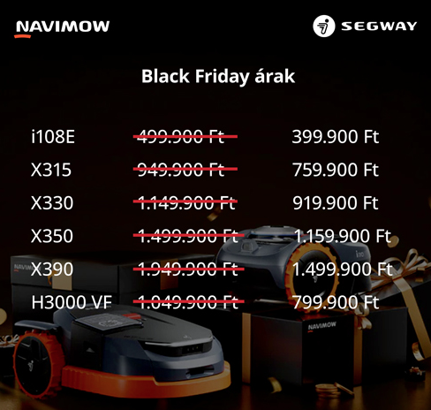 Ne maradjon le a fűnyírás egyik legkorszerűbb módjáról: a Segway Navimow hivatalos Black Friday akciója kihagyhatatlan, minden eddiginél nagyobb, akár 450.000 Ft-os árengedménnyel! A prémium, vezetékmentes robotfűnyírók egyik csúcsa kizárólag a készlet erejéig vásárolható meg ilyen kedvezménnyel, 2025. november 28. és december 1. között.