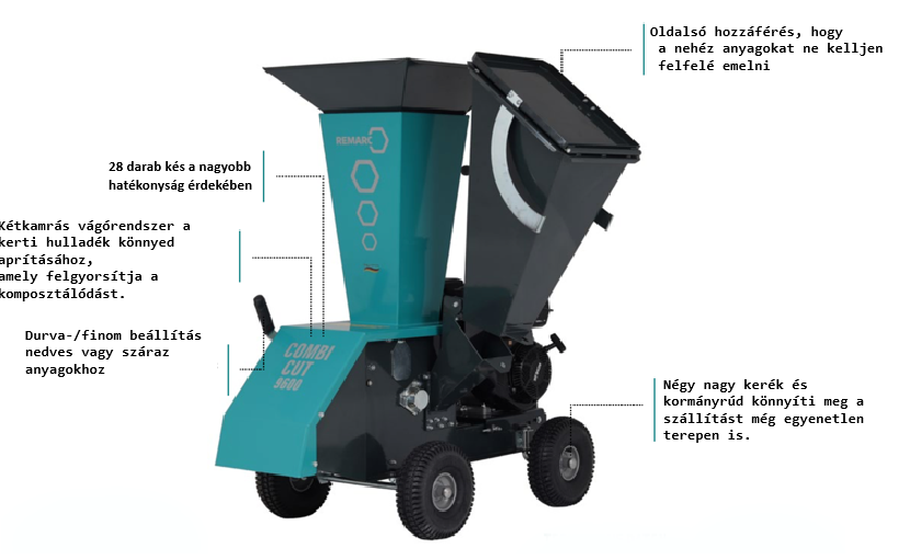 A Remarc Combi Cut 9600 egy professzionális, benzines, kétkamrás ágdaráló, amely akár 80–85 mm ágvastagságig és óránként kb. 830–850 kg zöldhulladék feldolgozására képes. Erős Kohler (vagy konfigurációtól függően Honda) motorjának, kombinált kalapácsos–késes aprítórendszerének és állítható durva/finom szitájának köszönhetően a Combi Cut 9600 a vastag ágaktól a konyhakerti hulladékig mindent gyorsan, homogén apró darabokra aprít. A négy nagy kerék és a praktikus kormányrúd megkönnyíti a mozgatást egyenetlen terepen is, így ideális választás kertészeti vállalkozásoknak, kommunális szolgáltatóknak és igényes magánfelhasználóknak.