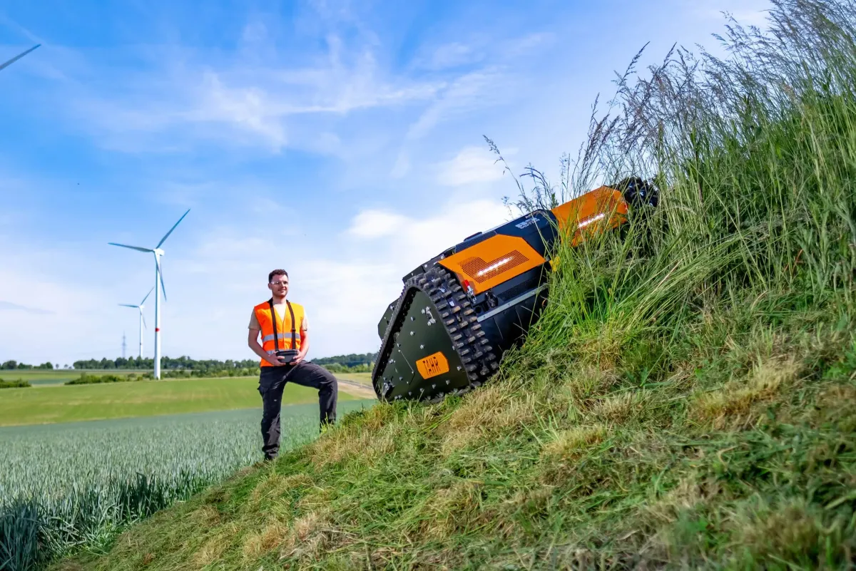 Biztonságos üzemeltetés: 300 m hatótávval rendelkező távirányító (EMERGENCY STOP, dőlésszenzor, jelvesztéskor motorleállítás) – a kezelő biztonságos távolságban marad a lejtőtől és a munkaterülettől.