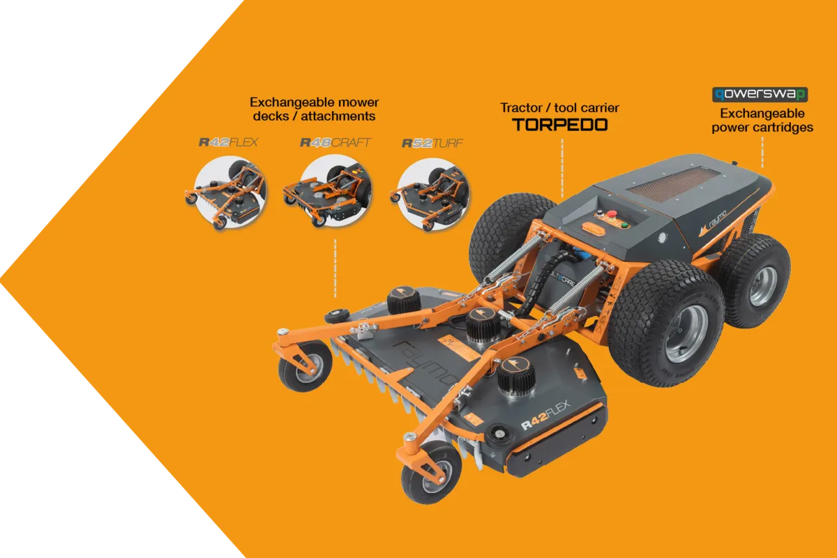 A Raymo Torpedo alapgép a szükséges üzemidő függvényében kétféle elektromos meghajtó egységgel (Powerswap 120 Ah vagy 150 Ah) kapható. A nyírandó felületek függvényében pedig négy különböző vágóasztalból tudunk választani. Az R42Flex egy igazi univerzális harcos, képes mulcsozásra és hátsó kidobásra is - általános felhasználásra javasoljuk parkfenntartók, önkormányzatok számára. Az R48Craft a legdurvább területek vágóasztala, kifejezetten ipari területek durva, akár magasgazos környezetében érzi magát otthon. Kiváló választás lehet napelemparkok nyírására. A harmadik, R52Turf vágóasztal pedig a nagy, igényes zöldfelületek, például sportpályák vagy parkok igényes nyírására való, finom mulcsozással tökéletes vágásképre képes. Végül egészen speciális területek, méhlegelők nyírására az S46Floris a megfelelő választás, mely elérhető szimpla vagy dupla késsel is.
